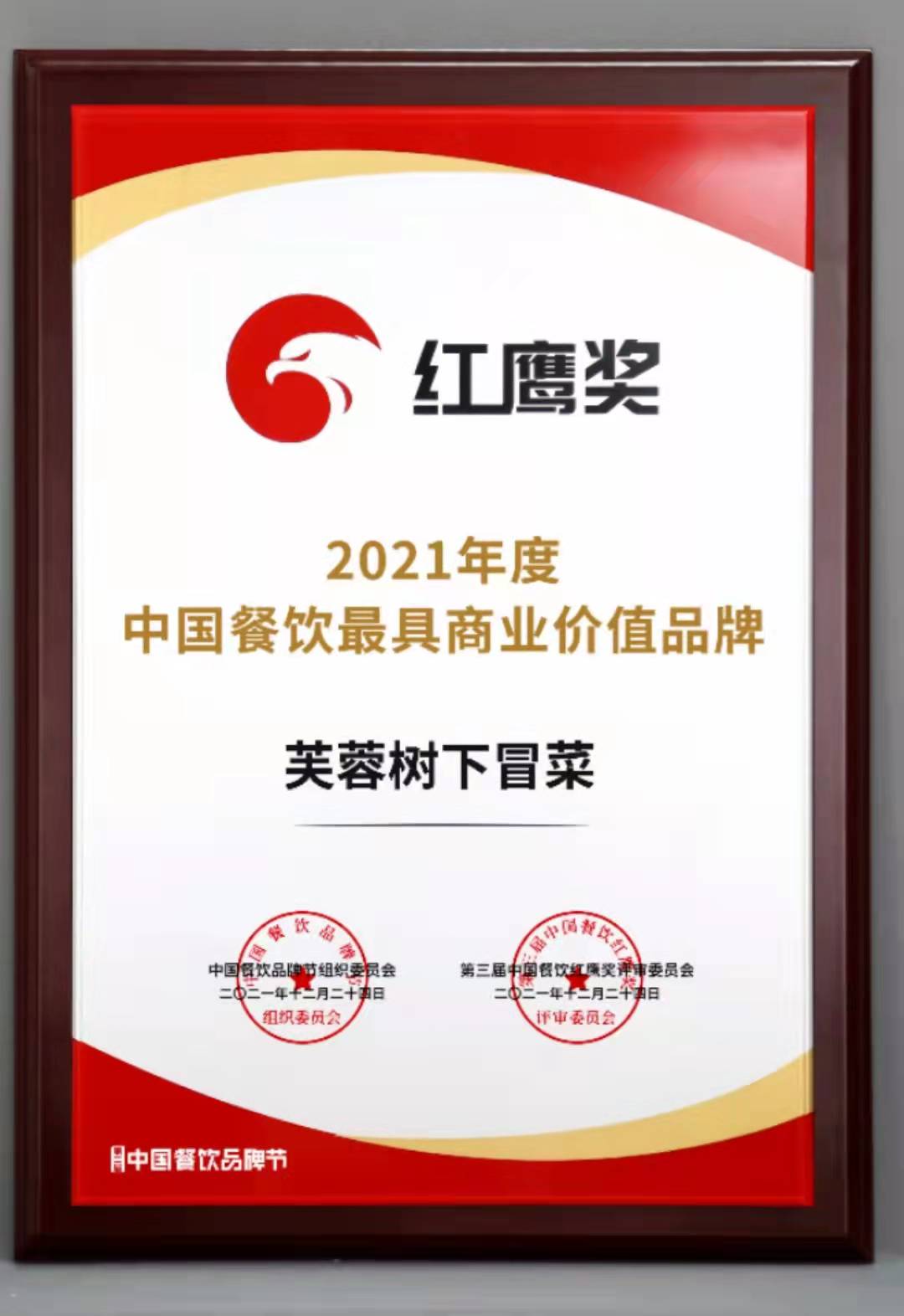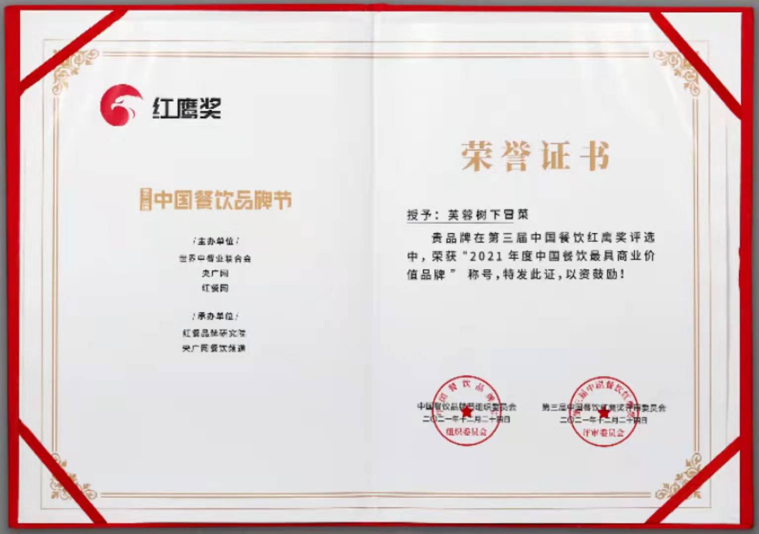 芙蓉树下 2021年度中国餐饮最具投资价值品牌 2021是不平凡的一年,在经历这魔幻的一年中,我们越来越清楚,优胜劣汰,只有努力成为头部品牌,餐企才能更好地活下去,这是餐饮行业的生死法则。 而在首届中国餐饮红鹰奖中“芙蓉树下”荣获“2021年度中国餐饮最具投资价值品牌”每一份的认可都是对我们的莫大鼓励,进步,才是我们应该有的现象,不断进步,将成为我们持之以恒的目标!