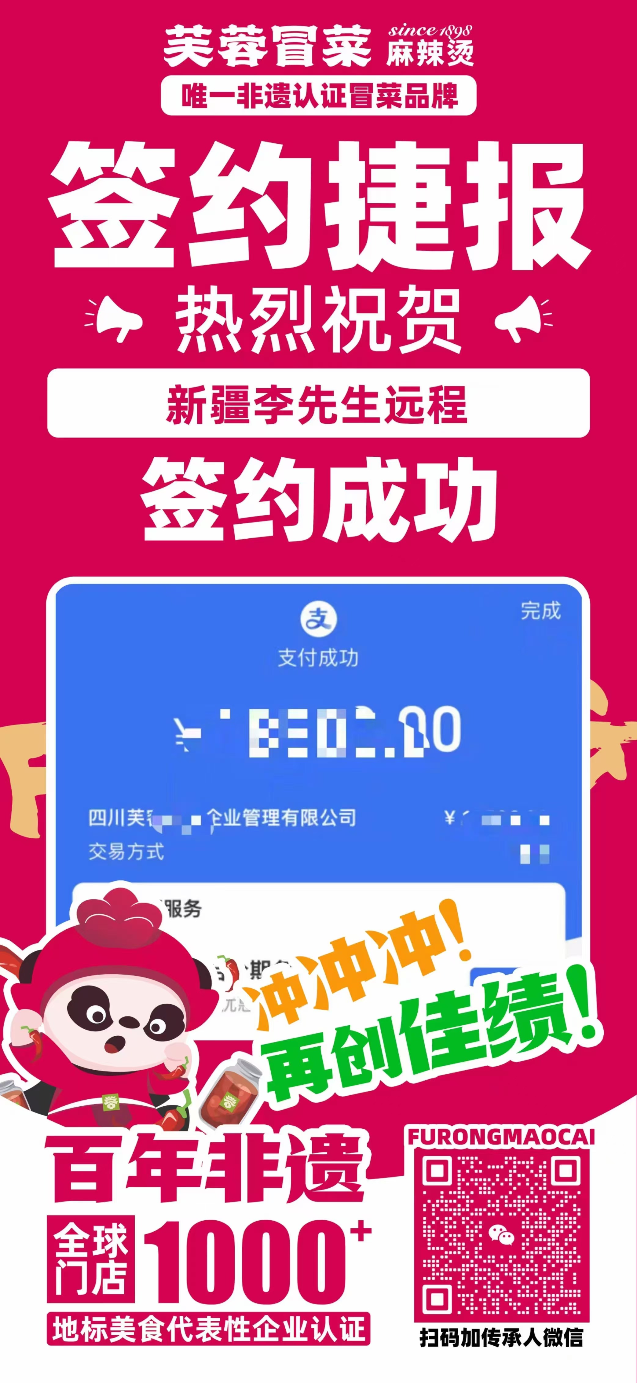 恭喜阿坝的陈女士远程签约冒菜加盟10大品牌的芙蓉冒菜,陈女士是成都人,打算在当地做清真,觉得我们的非遗品牌在市场上更有竞争力,就和冒菜加盟10大品牌的芙蓉冒菜的招商经理进行沟通,深深的被我们非物质文化遗产项目吸引。对于产品口味、公司运营等服务,觉得芙蓉冒菜不愧是冒菜加盟10大品牌,直接决定签约合作,感谢陈女士的信任,接下来是准备筹店工作,预祝门店早日开业,生意兴隆,财源滚滚。